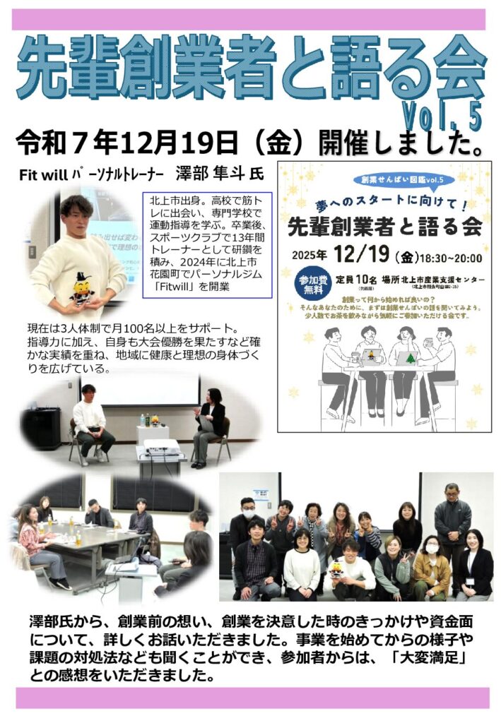 令和7年12月19日(金)、先輩創業者と語る会の第5回が開催されました。当センターでは、創業・起業を夢見る方を対象に先輩と語り合う会を開催しております。次回は令和8年2月に開催予定です!ご興味をお持ちの方はお気軽にご参加ください!